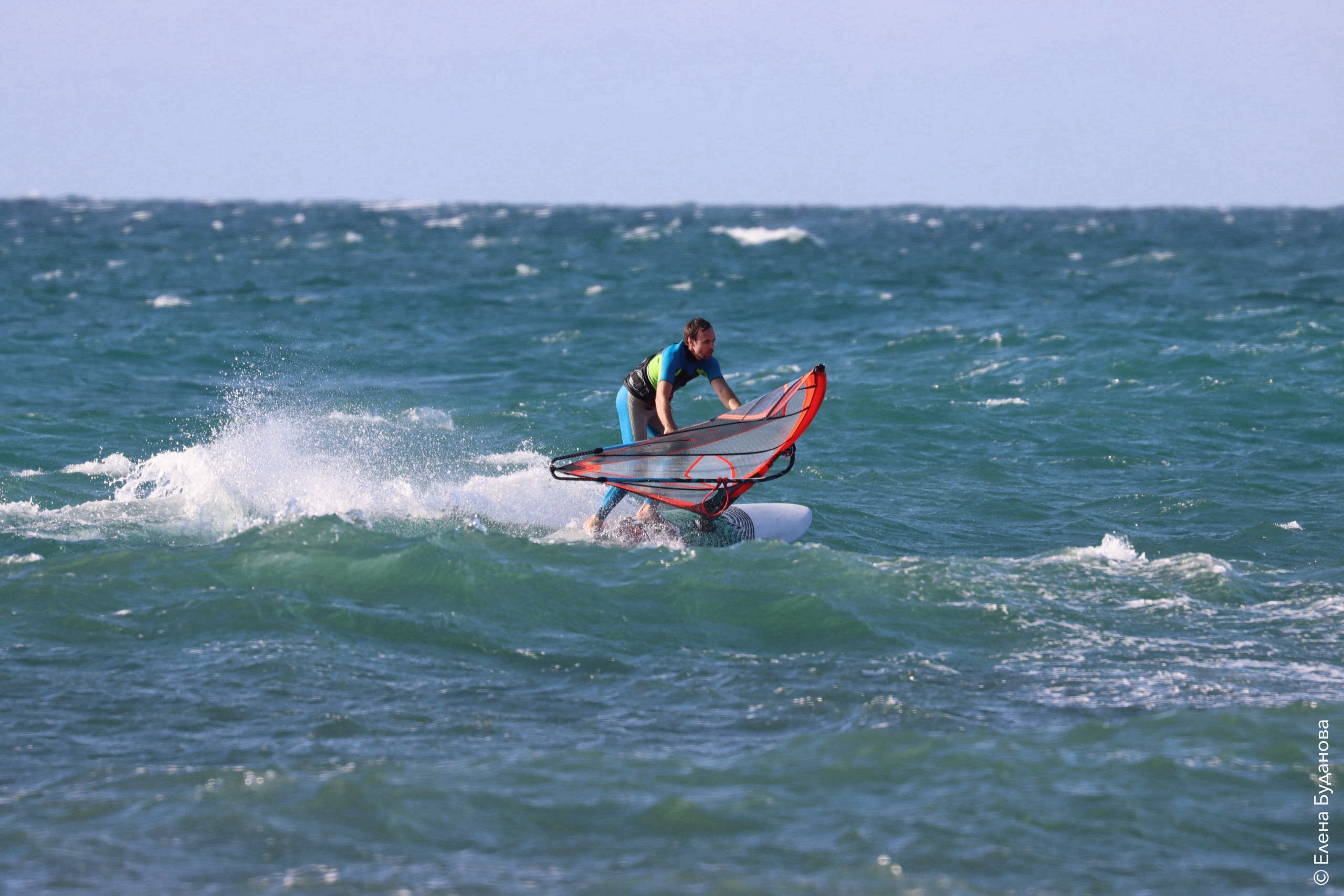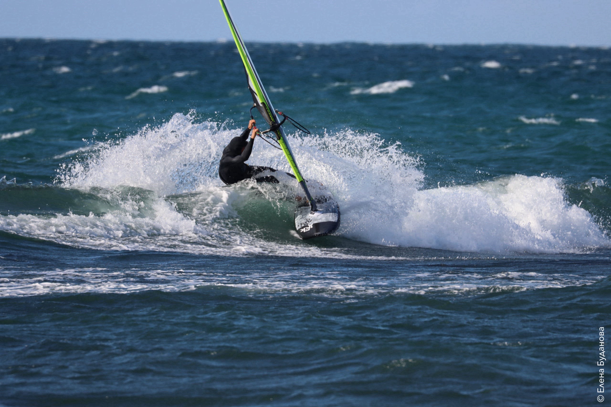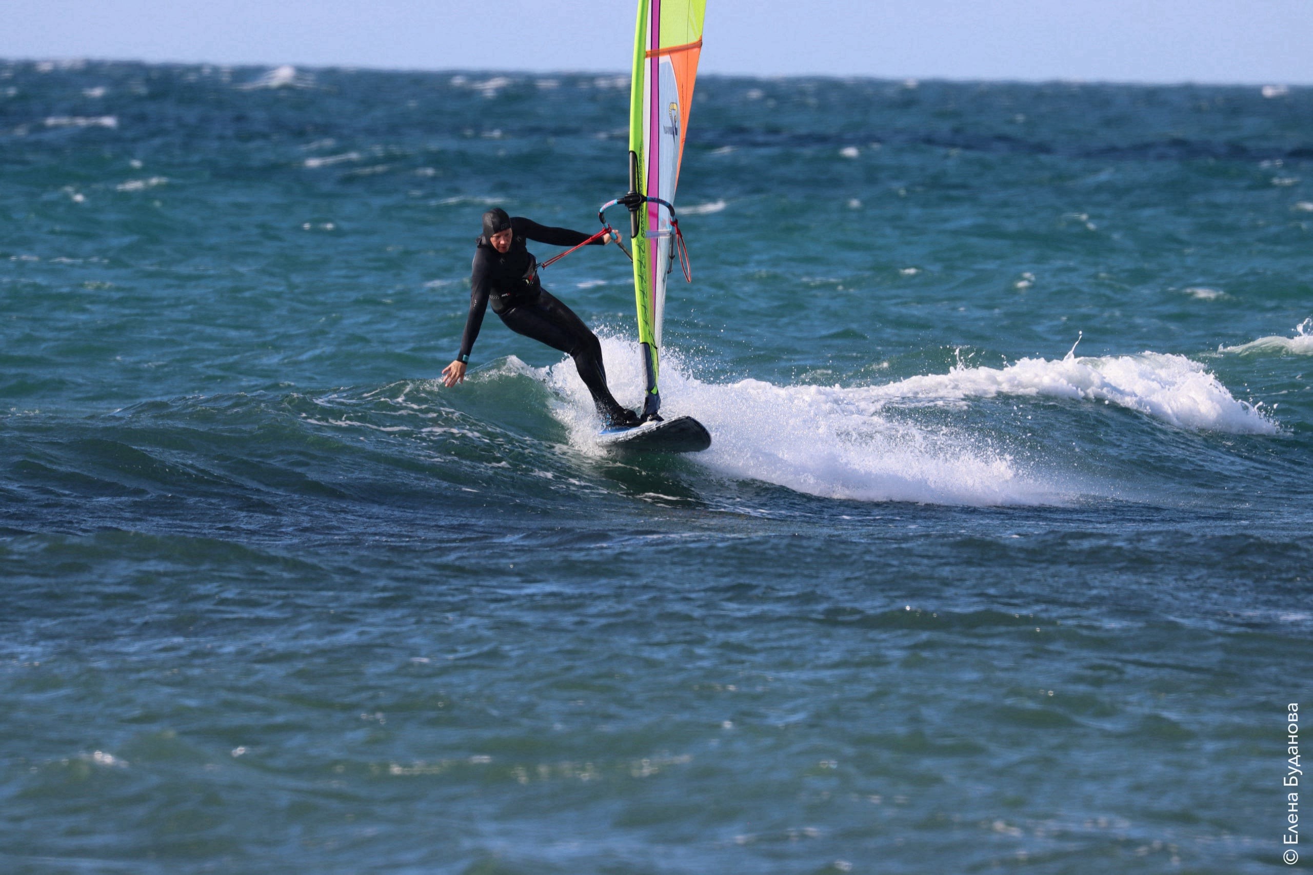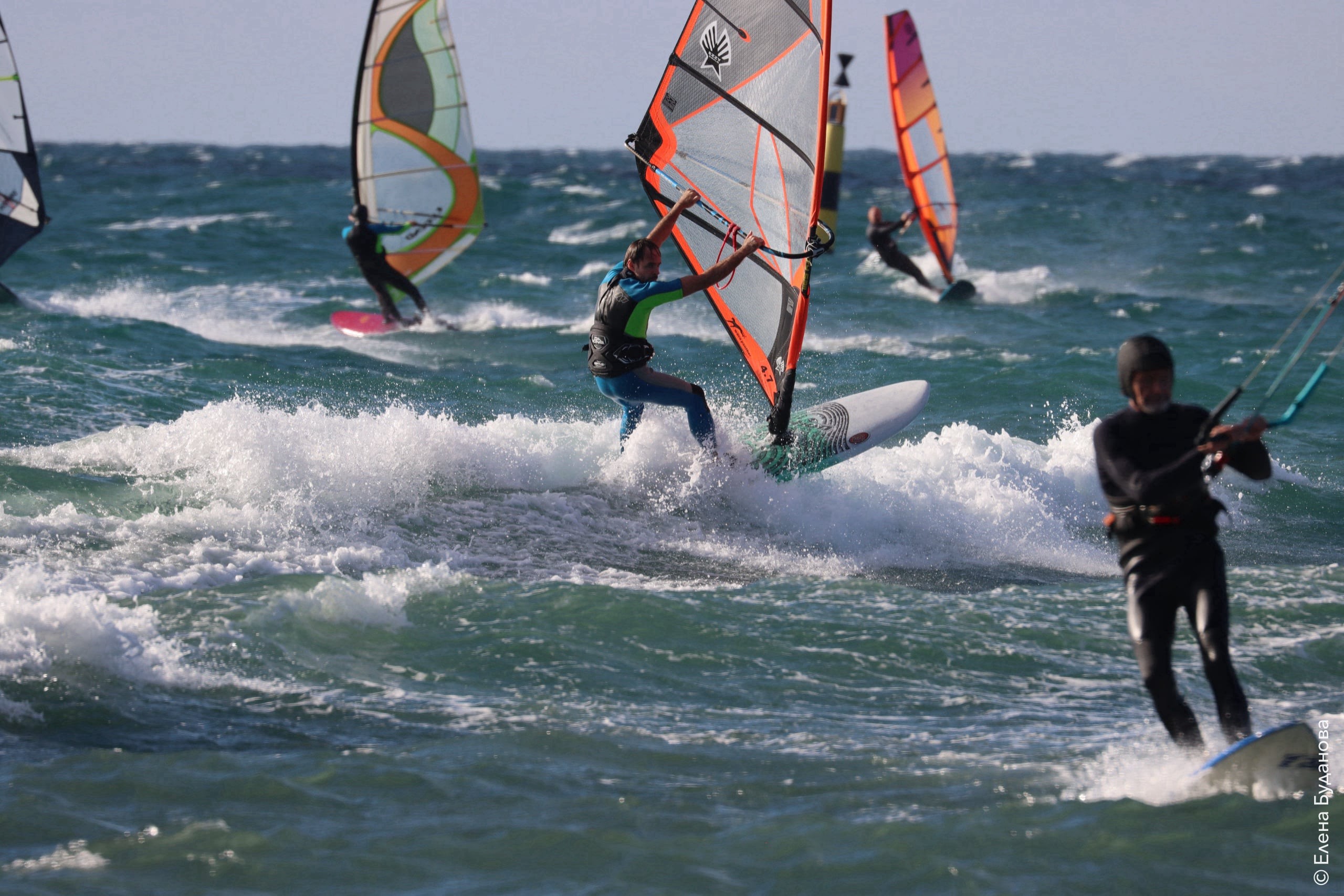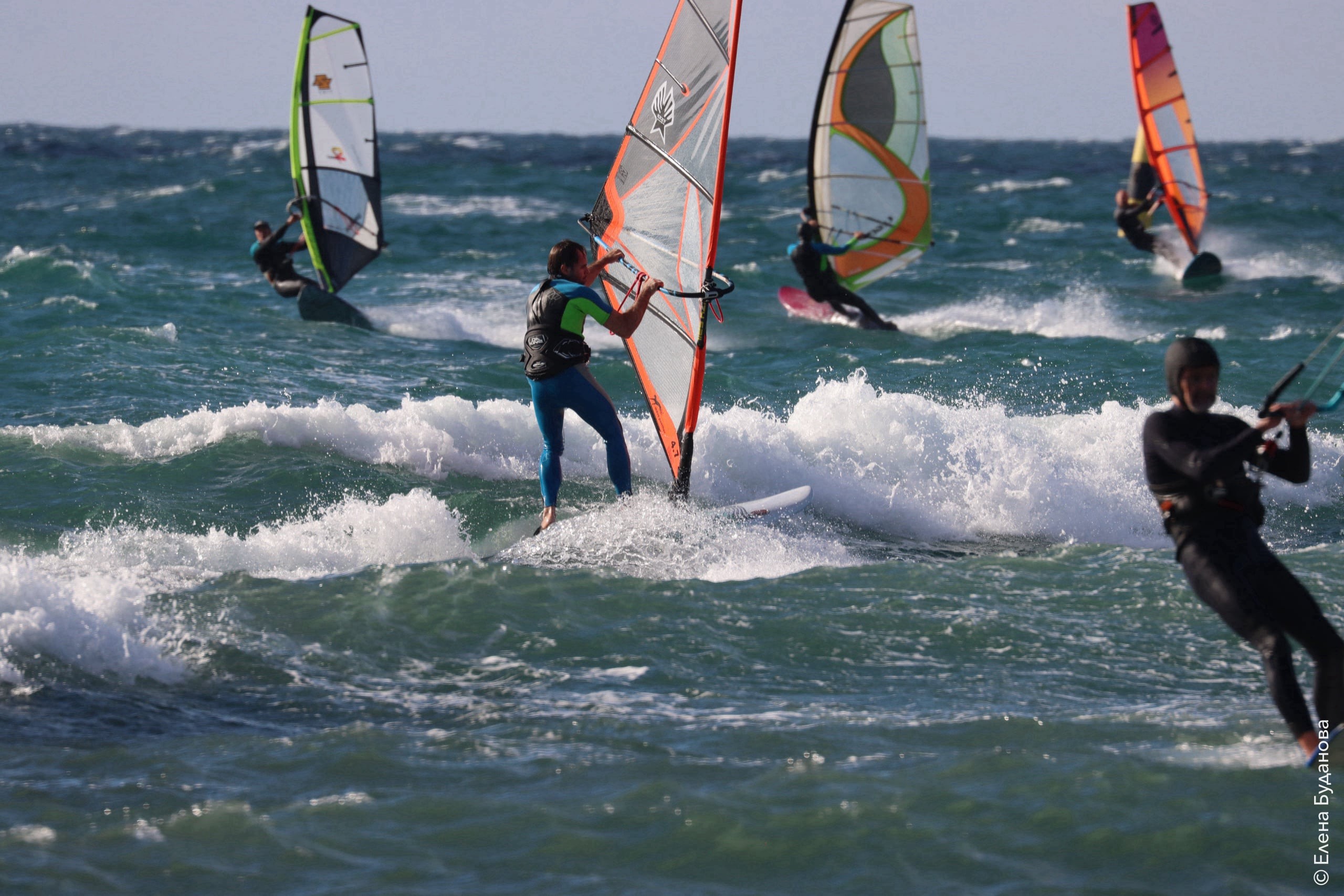 Все так-же тепло, как и в прошлый понедельник. Условия еще лайтовее, доски 80-100, паруса 4.2–4.7, девушки на 3.7. Небольшая волна пошла после обеда, немного разнообразив каталку.