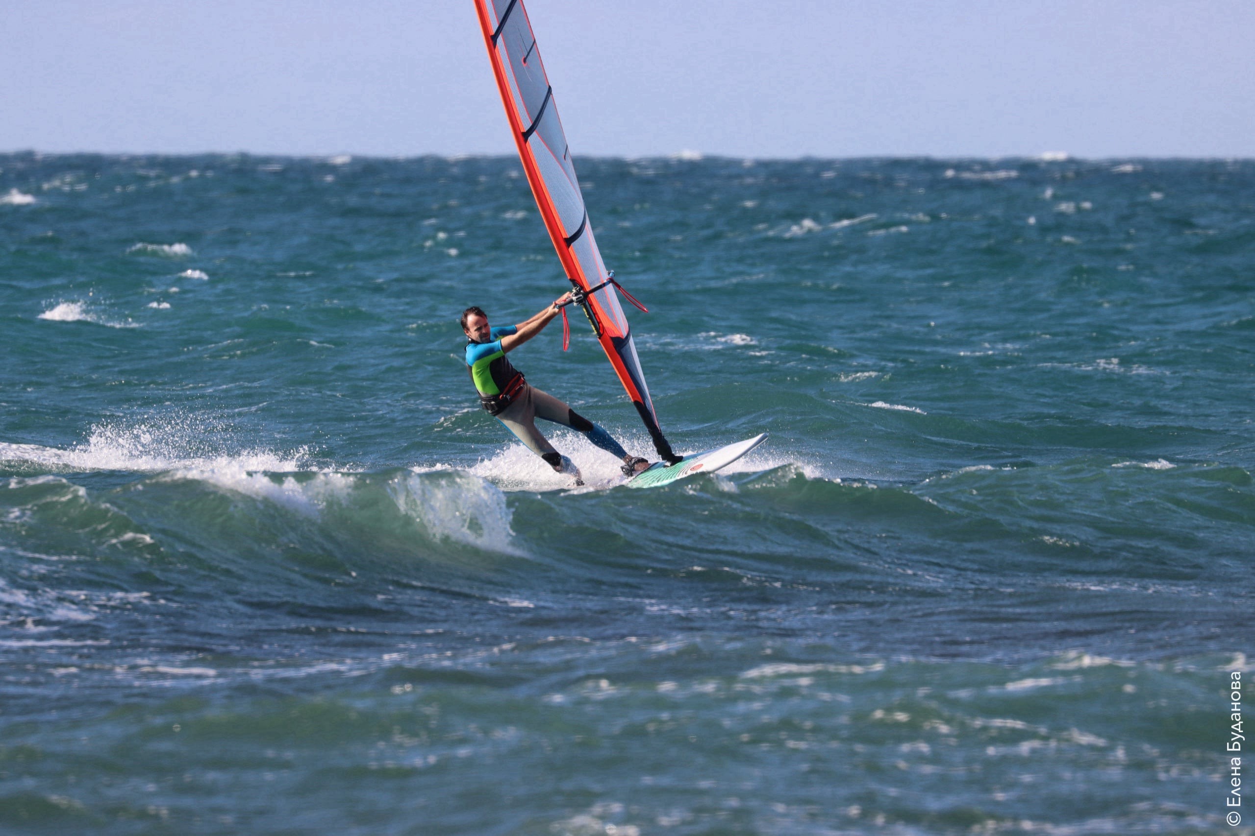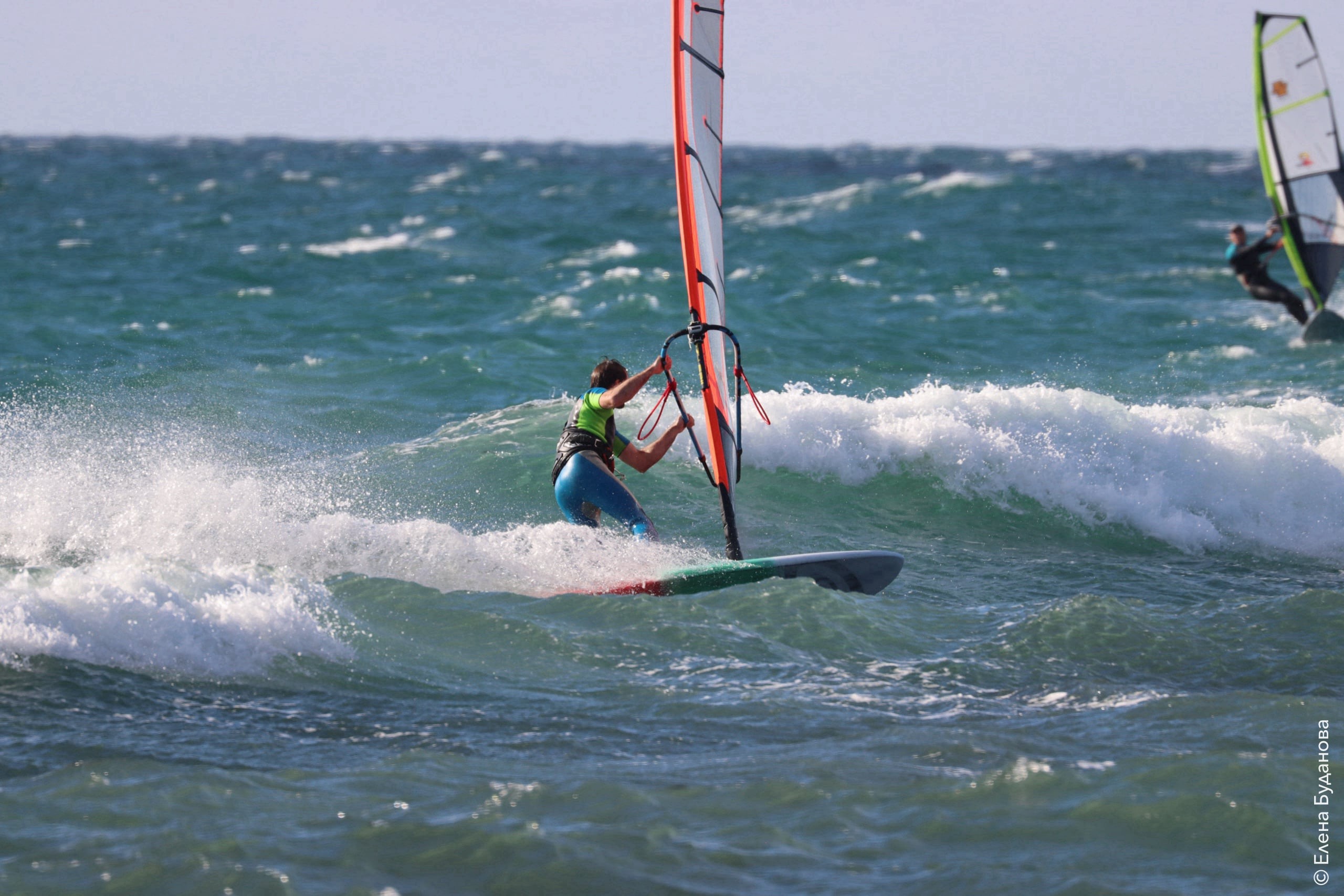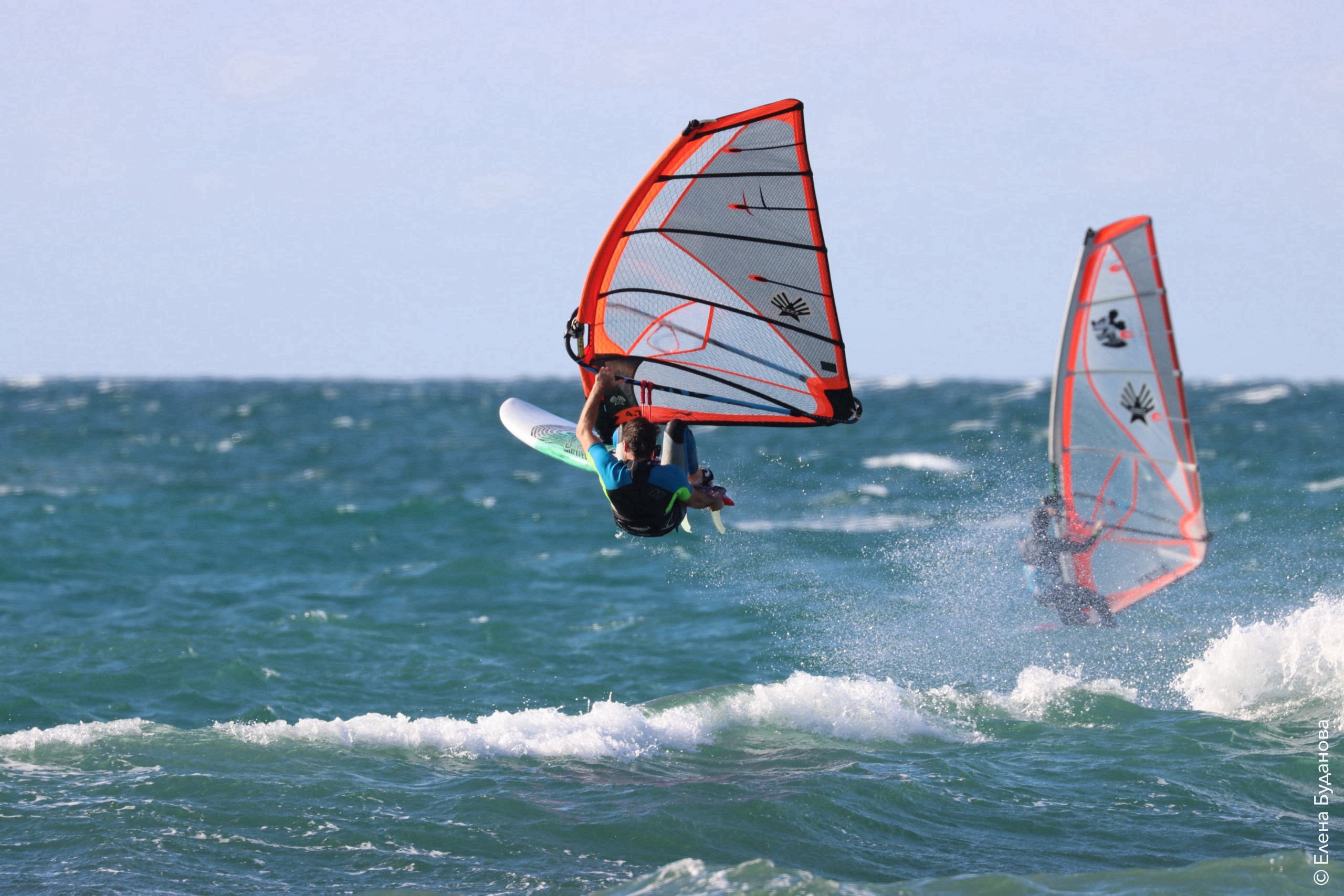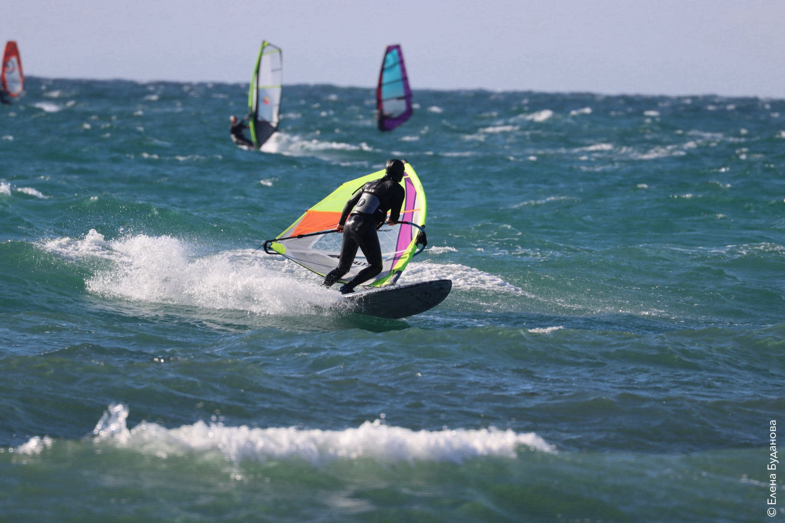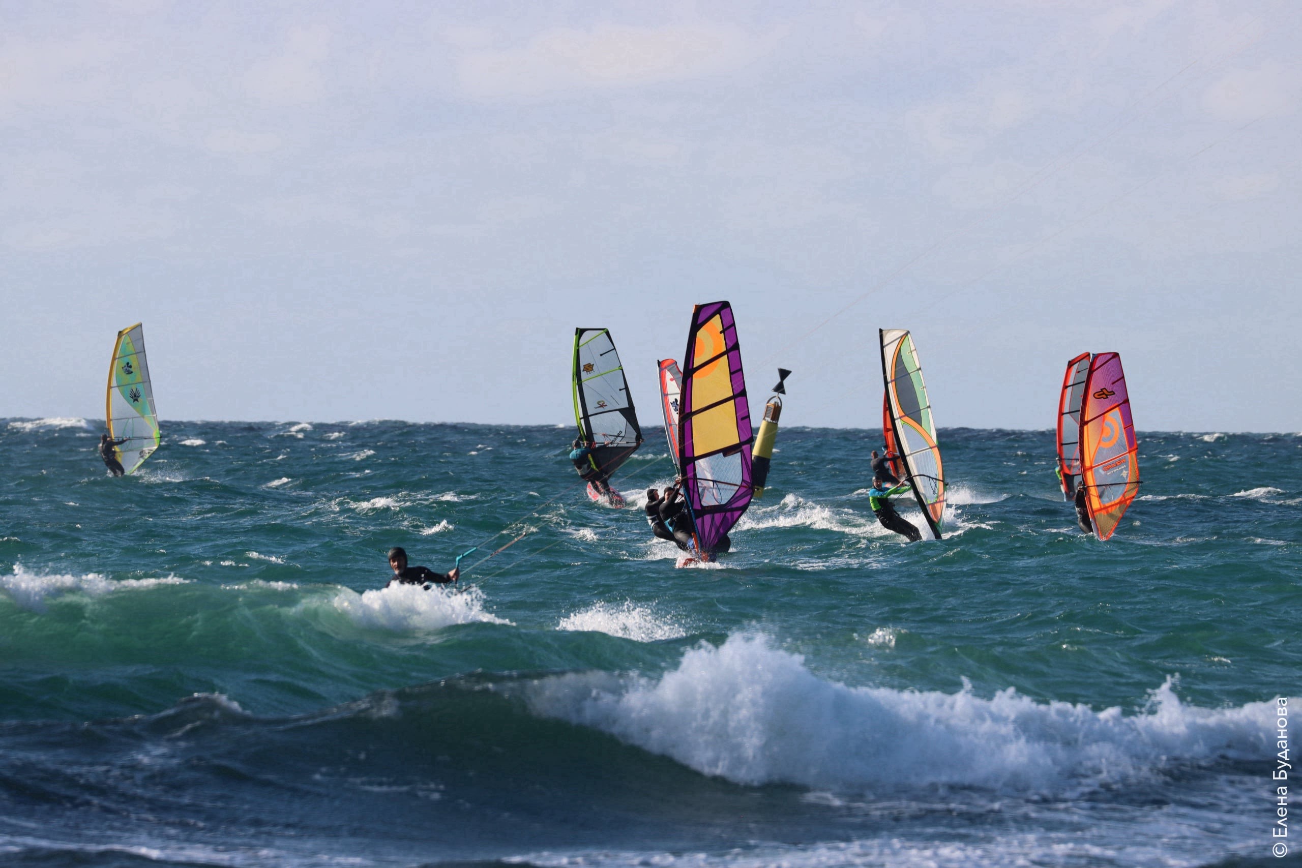 Все так-же тепло, как и в прошлый понедельник. Условия еще лайтовее, доски 80-100, паруса 4.2–4.7, девушки на 3.7. Небольшая волна пошла после обеда, немного разнообразив каталку.
