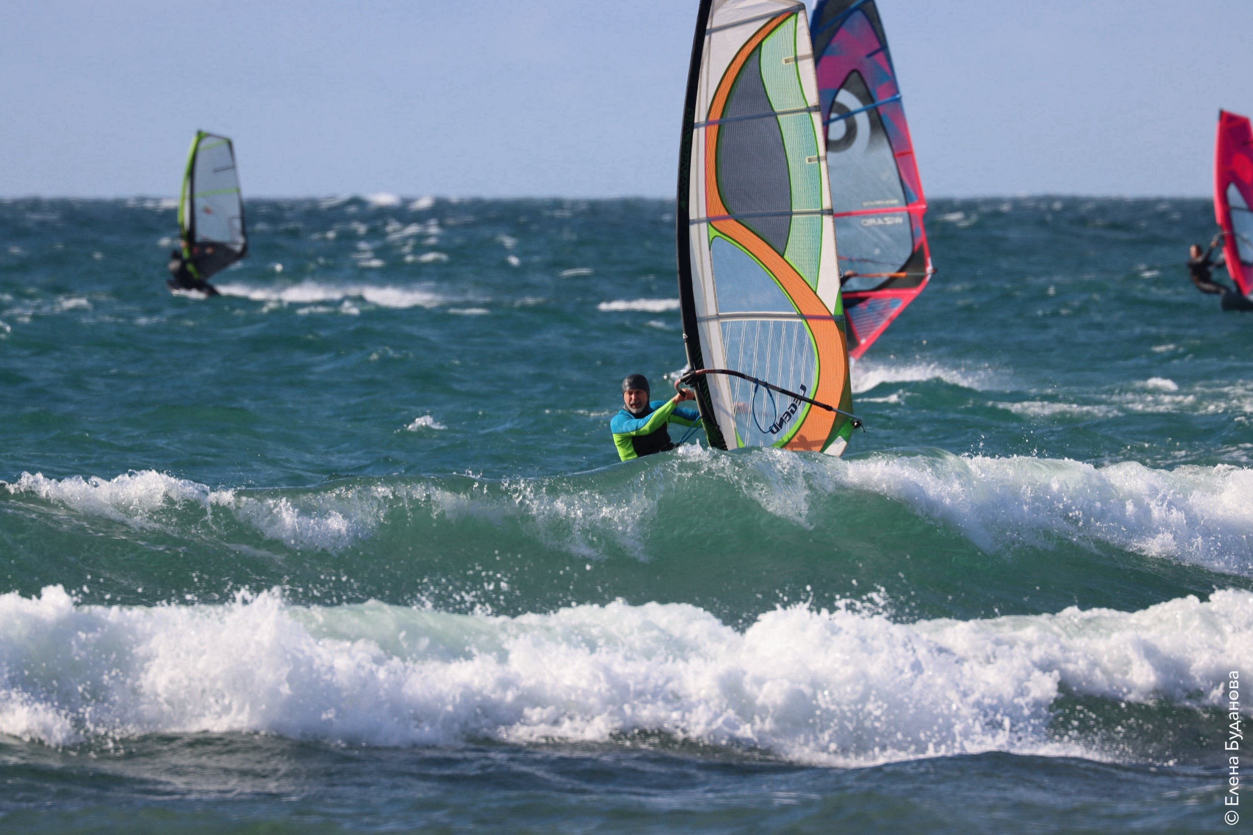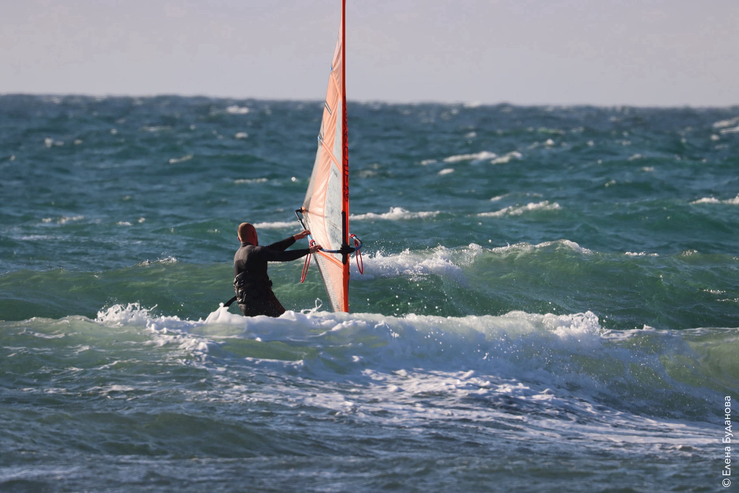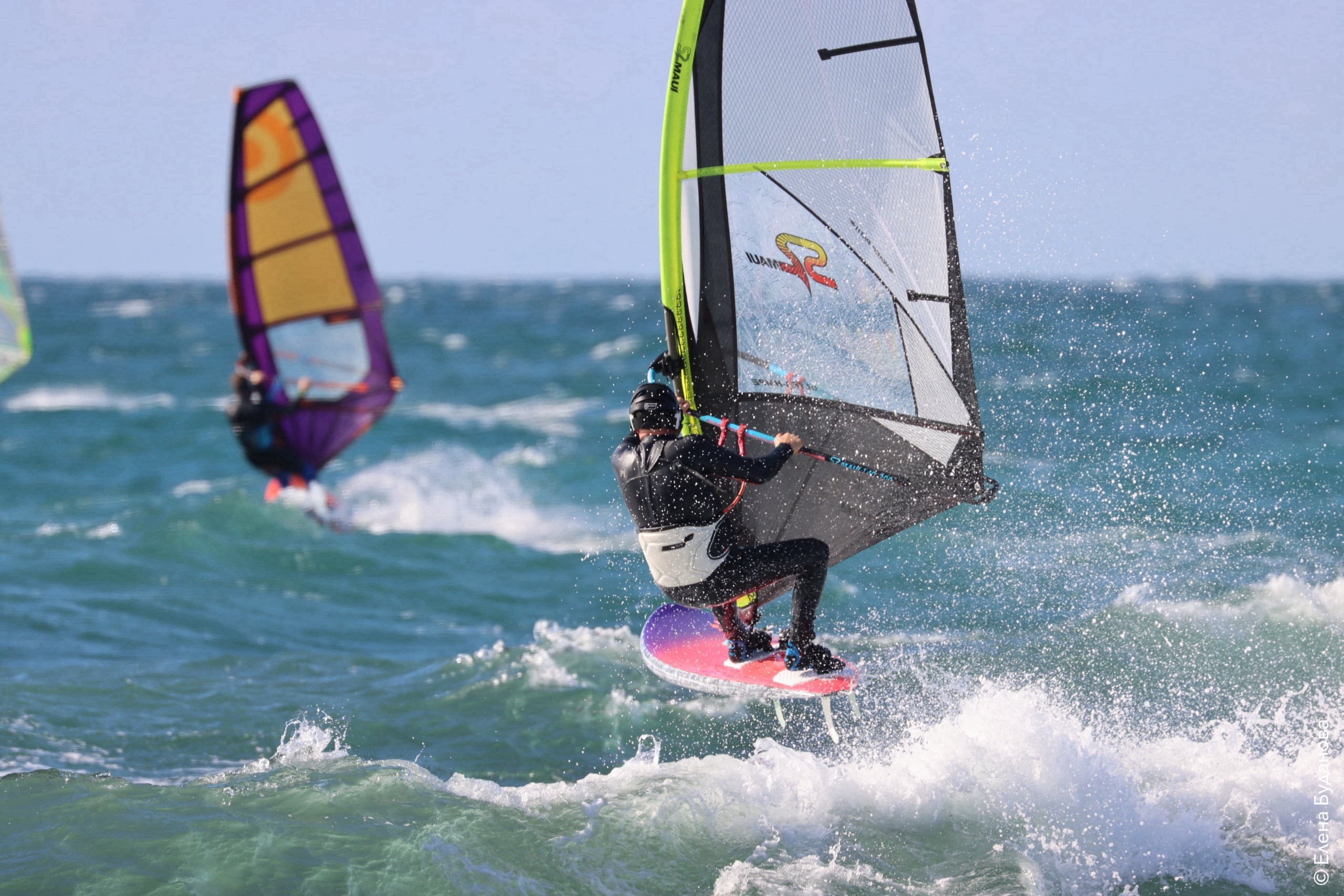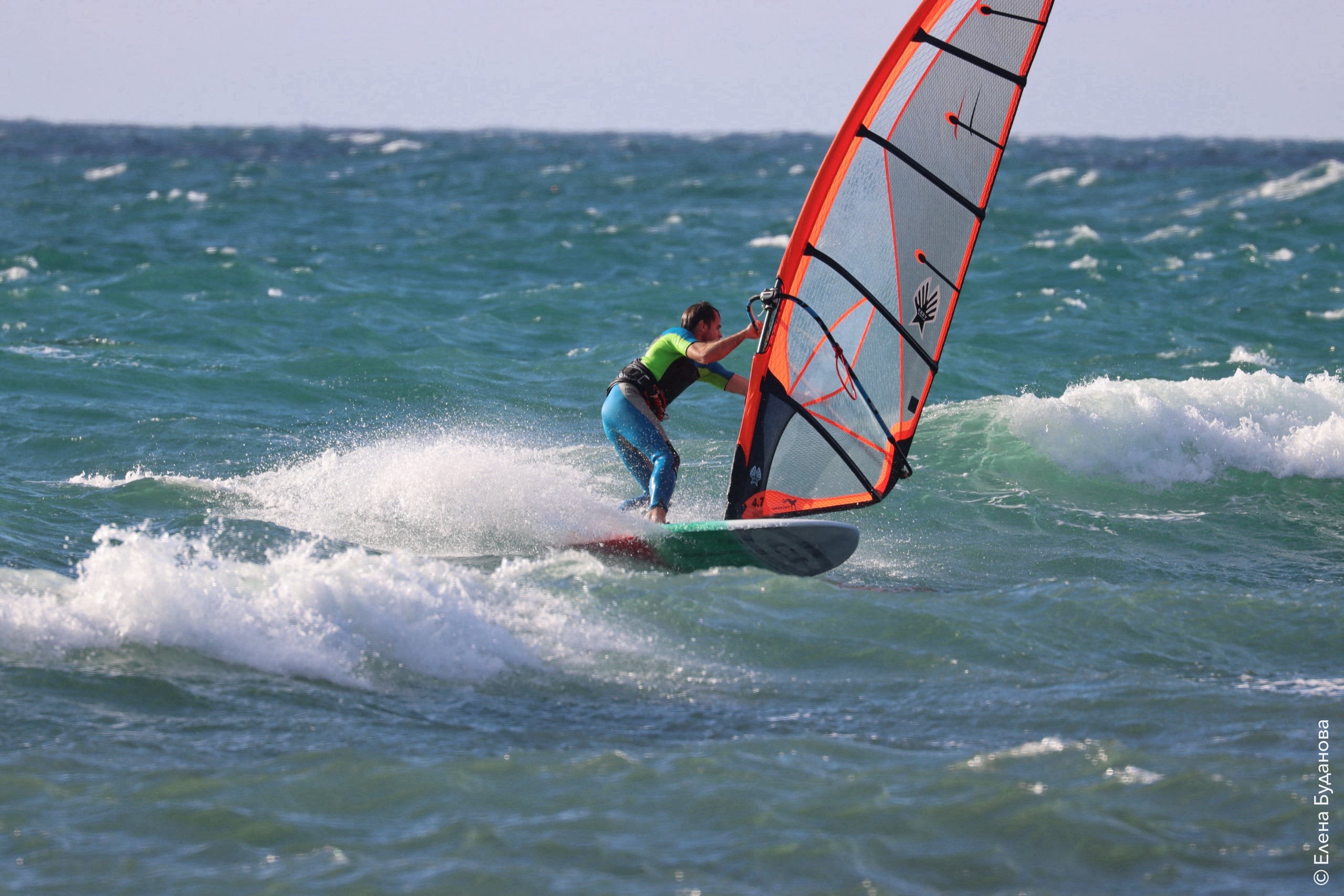 Все так-же тепло, как и в прошлый понедельник. Условия еще лайтовее, доски 80-100, паруса 4.2–4.7, девушки на 3.7. Небольшая волна пошла после обеда, немного разнообразив каталку.